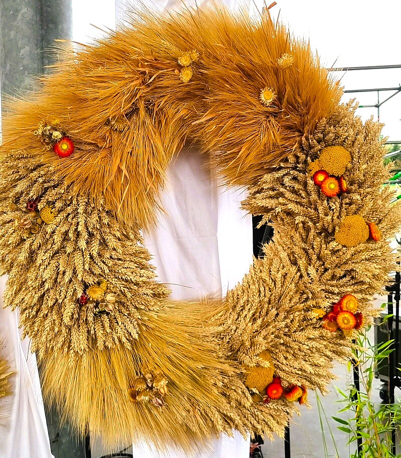 Für das Erntedankfest im Magdeburger Elbauenpark ist ein ganz besonderer Erntekranz entstanden. Gebunden wurde er aus dem, was unsere eigenen Felder hervorgebracht haben: Gerste, Weizen und Durumweizen. Für die Farbtupfer sorgen leuchtende Strohblumen – kleine Sonnen im Kranz, die ihn lebendig machen.